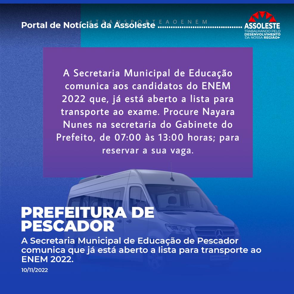 A Secretaria Municipal de Educação de Pescador comunica que já está aberto a lista para transporte ao ENEM 2022 11 de novembro de 2022 Fonte: Prefeitura de Pescador.