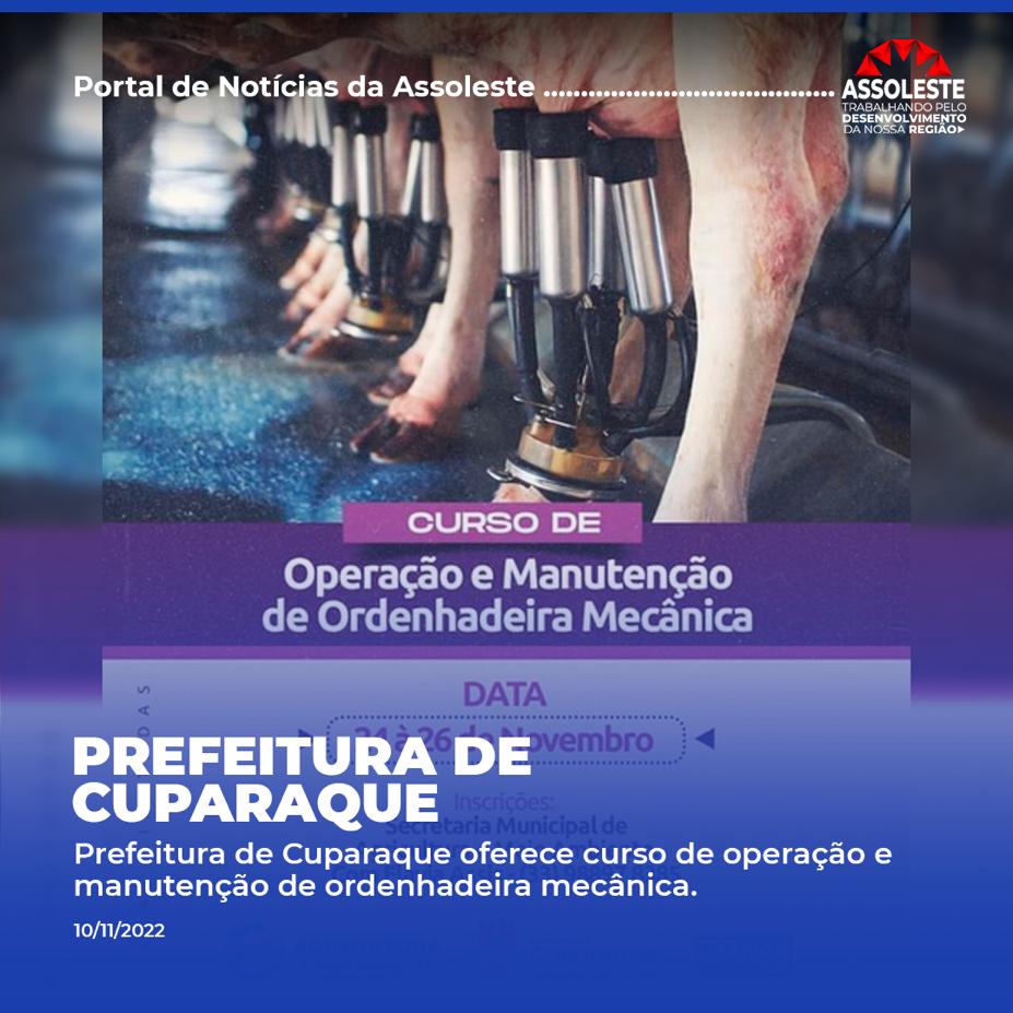 Prefeitura de Cuparaque oferece curso de operação e manutenção de ordenhadeira mecânica 11 de novembro de 2022 Fonte: Prefeitura de Cuparaque.