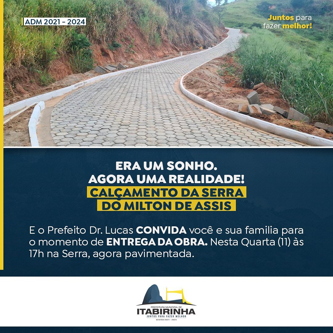 E o Prefeito Dr. Lucas convida você e sua famílai para o momento de entrega da obra. Nesta Quarta (11) às 17h ma Serra, agora pavimentada.