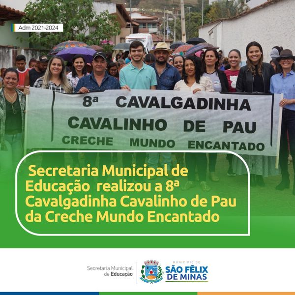 Nesta última sexta-feira (8/7) a Secretaria Municipal de Educação juntamente com Prefeitura Municipal, realizou a 8ª Cavalgadinha de Cavalinho de Pau da Creche Mundo Encantado.O evento contou com a participação das crianças, pais, profissionais da educação e também contou com a presença das autoridades locais
